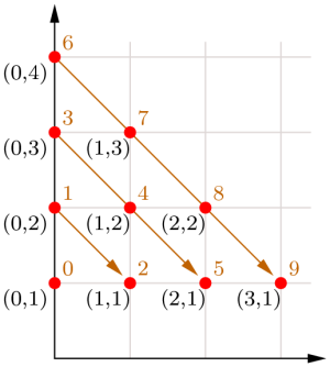 Il s'agit d'une relation d'ordre puisqu'on vérifie aisément que # est réflexive (p/q # p/q), antisymétrique (si p1/q1 # p2/q2 et p2/q2 # p1/q1 alors p1/q1 = p2/q2) et transitive (si p1/q1 # p2/q2 et p2/q2 # p3/q3 alors p1/q1 # p3/q3). En outre, il est immédiat de constater que toute fraction est bien dans un sac, autrement dit que l'on a établi un ordre total sur Q. Ce n'est pas un petit résultat intermédiaire perdu dans les détails d'une longue preuve: en fait on a construit l'ordre usuel sur Q. Retenez l'idée (1° grouper par p+q constant puis 2° trier par p croissant).